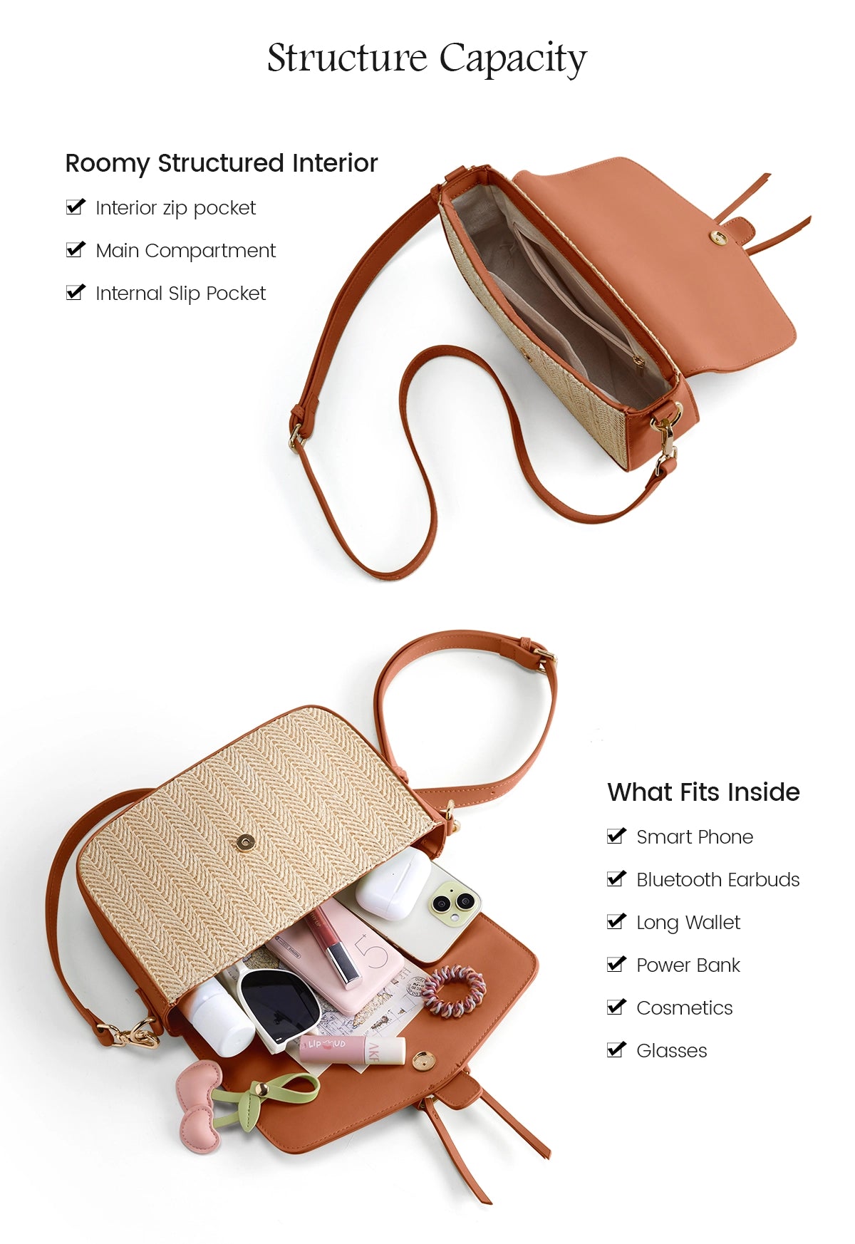 Crafted from natural raffia and faux leather, this eco-friendly crossbody bag is stylish and durable. The breathable cotton-linen lining adds comfort, while the woven leather strap and magnetic clasp provide easy access. Inside, a zipper and slip pocket keep essentials organized. The PU leather bottom enhances durability and allows the bag to stand upright. The adjustable strap offers versatile wear options.